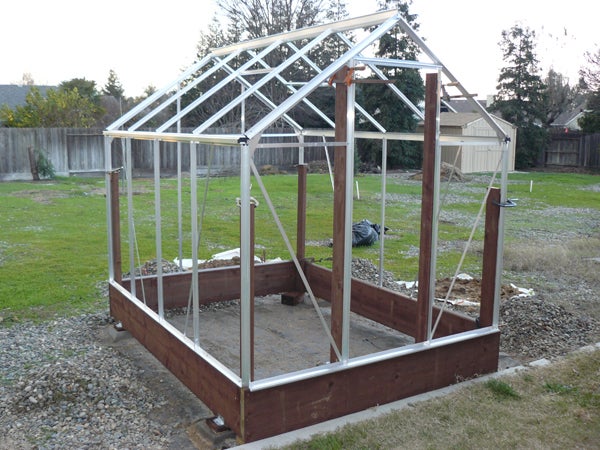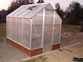 This aluminum greenhouse lets you grow vegetables plants and flowers out of season. Built on a Custom Framed Short Wall Foundation. On unfinished framed foundation.